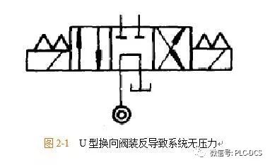 設(shè)備在檢修,元件裝拆更換后出現(xiàn)壓力為零現(xiàn)象,可能原因如下:液壓泵未裝緊,不能形成工作容積;液壓泵內(nèi)未裝油,不能形成密封油膜;換向閥芯裝反;換向閥裝反,如果系統(tǒng)中有U型中位機能的換向閥,一旦裝反,便使系統(tǒng)泄壓(如圖2-1所示)。