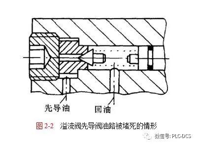 例,某液壓設(shè)備溢流閥,因不慎將先導(dǎo)閥座前端螺塞擰得過緊,將先導(dǎo)油路切斷(如圖2-2所示),結(jié)果使系統(tǒng)壓力升至9MPa,還超出正常調(diào)整壓力4MPa。