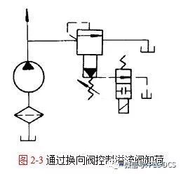 液壓系統(tǒng)中的卸荷控制方式一般通過換向閥控制溢流閥或采用M型中位機能的換向閥來實現(xiàn),其液壓回路分別如圖2-3和圖2-4所示。